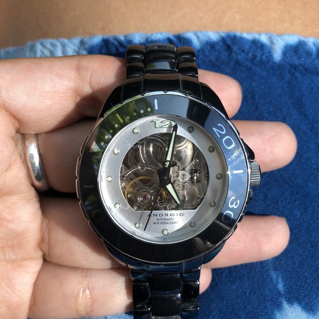 Black bezel skeleton automatic wrist watch.